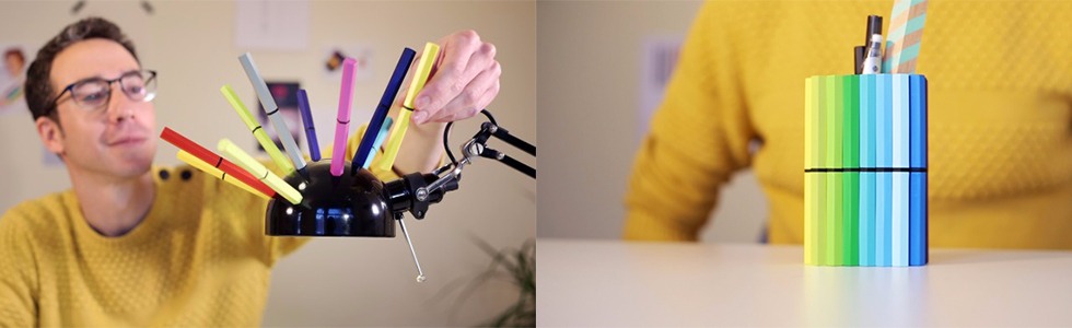 产品设计师 Noam Bar Yohai 注意到,使用彩色笔虽然方便但易造成办公桌杂乱。墨水用完后,笔壳就变得毫无用处。于是他将把创意放在笔壳上,让它们化为各种用途的工具——可以随心所欲的变成笔筒,相框支架等。有了这套吸铁石水彩笔,你再也不用担心自己的笔滚到一旁找不到了!并且,它们可以吸附到一起,妈妈再也不用担心你罚抄单词时速度不够快了!!