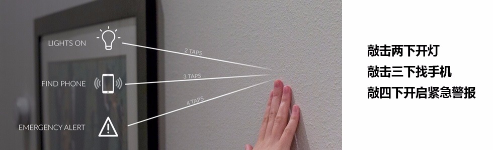 科技改变生活,可为什么这些高科技产品控制起来却是如此的麻烦呢?数不尽的APP,智能开关和各种操控界面用起来真的是不方便。Knocki 将给你带来全新体验,它是一个小型无线设备,它能将一整面墙、桌面或者橱柜表面都可以变成控制面,用户可以通过敲击来对家中的智能设备进行控制。当用户将 Knocki 固定在墙上、床头柜上或者桌子上的时候,它能够感知到用户在这些物体表面上的敲击;并且 Knocki 能够在感知到不同的敲击方式时实现不同的功能,比如敲击两下可以开灯,敲击三下找手机,敲四下开启紧急警报等等。